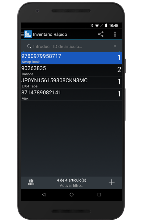 La versión actual de Inventario Rápido soporta escanear código de barras en el campo de búsqueda Código de barras / ID de artículo en la lista de artículos. Además del escáner de cámara interno, Inventario Rápido permite utilizar escáneres Bluetooth de código de barras externos: